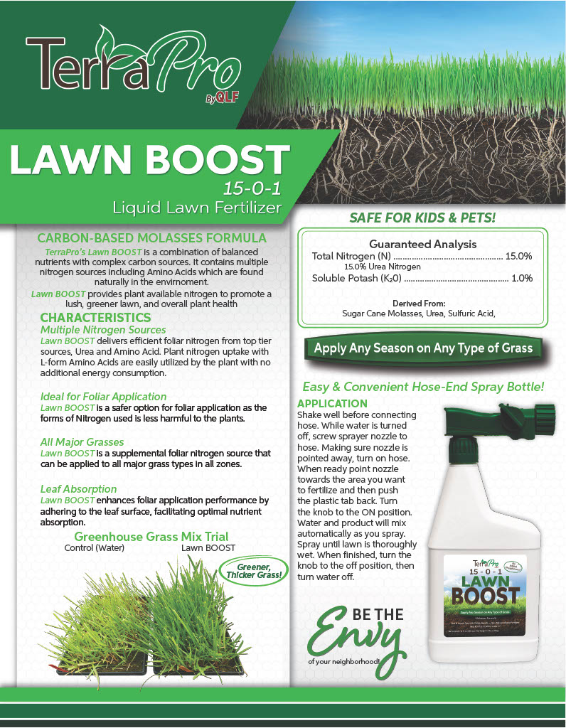 QLF's TerraPro is a non-toxic, pet-safe, and child-safe liquid fertilizer. It contains no synthetic carbon, fluorinated compounds, or heavy metals, making it safe for use on lawns, gardens, and potted plants. As a best practice, it is still recommended to let all lawn treatments dry completely before allowing pets onto the area.