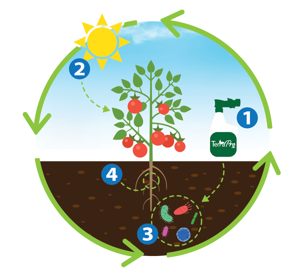 Healthy soil works in a cycle. TerraPro helps activate that cycle by feeding the biology that makes nutrients available to plants.